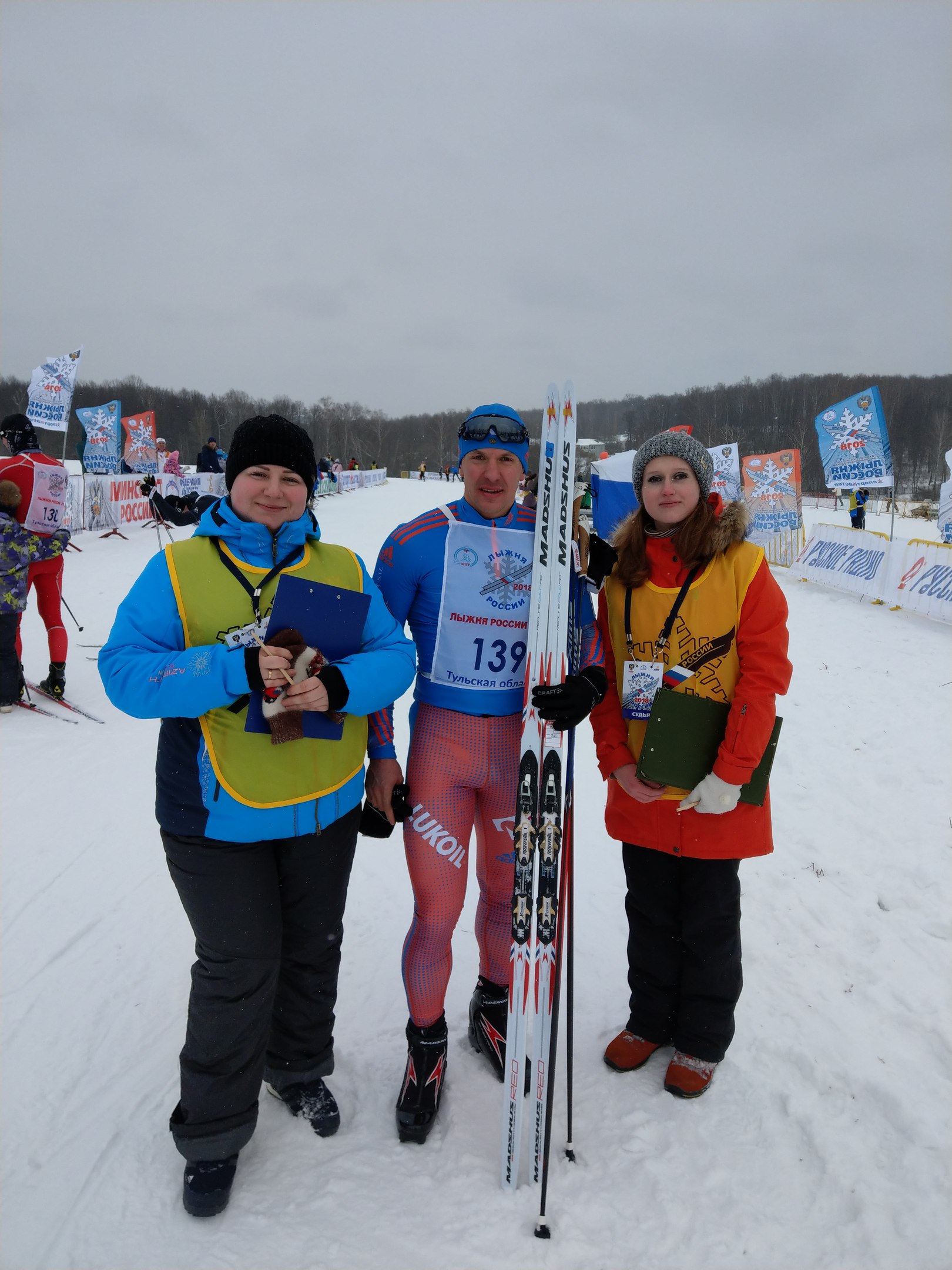 олимпийская чемпионка Светлана Журова , легендарный лыжник, двукратный олимпийский чемпион, почетный житель Тульской области Вячеслав Веденин , советник при Президенте по культуре Владимир Толстой, трехкратный олимпийский чемпион Владислав Третьяк, олимпийская чемпионка Ольга Слюсарева, депутаты Госдумы от Тульской области Владимир Афонский и Виктор Дзюба. На старт лыжных гонок заявилось около семи тысяч участников не только из Тульской области, но и соседних регионов. В соревнованиях приняли участие, как и любители, та к и профессиональные спортсмены. В том числе бронзовый призёр Олимпийских игр 2010 года в командном спринте свободным стилем, двукратный призёр чемпионатов мира Николай Морилов , победитель Универсиады, чемпион мира среди молодежи до 23 лет Шакирзянов Рауль.