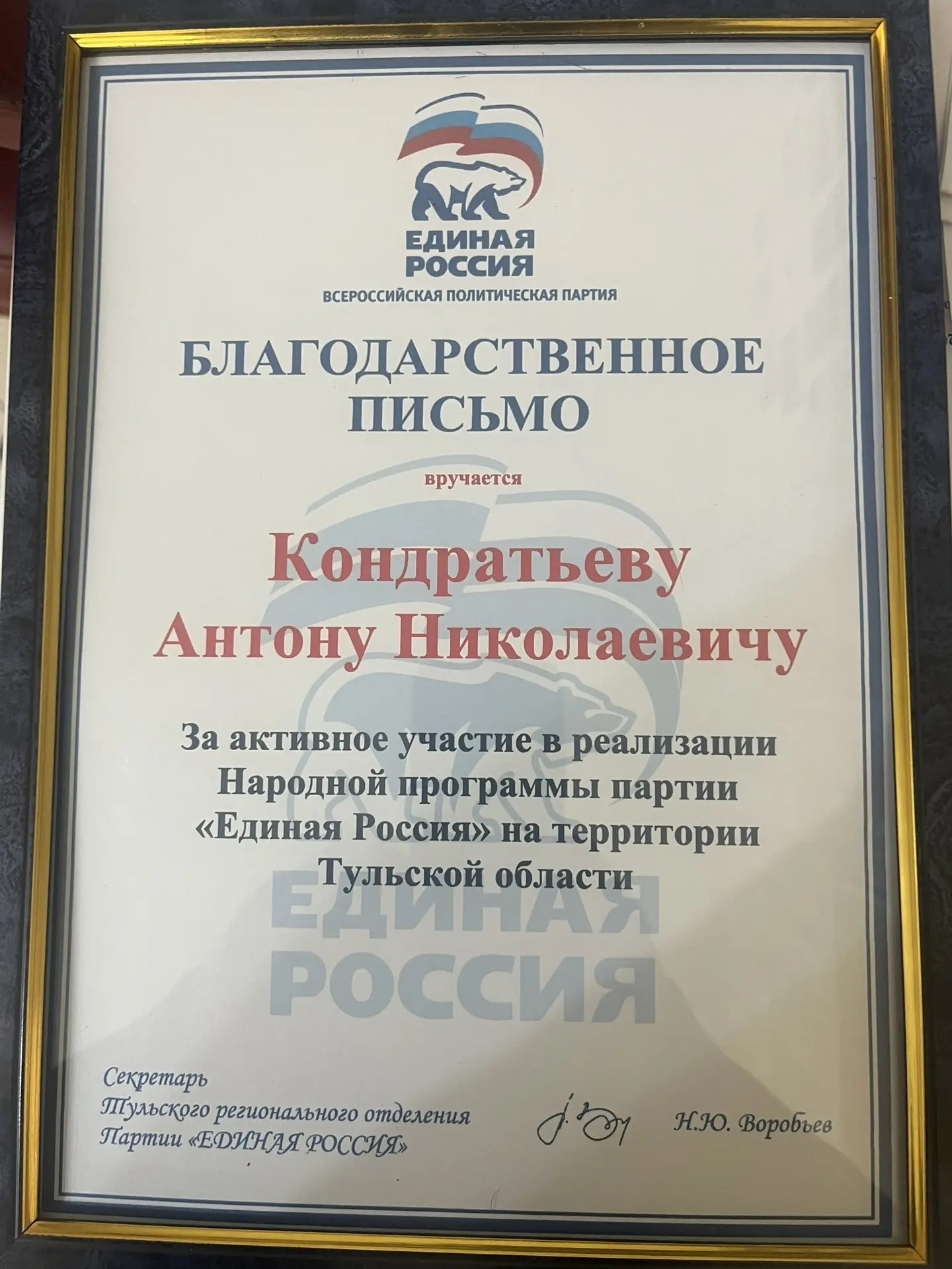 Руководитель МБУДО СШОР "Восток" Кондратьев Антон Николаевич был награжден Благодарственным Письмом "За активное участие в реализации Народной программы партии "Единая Россия" на территории Тульской области" !!!!!!!