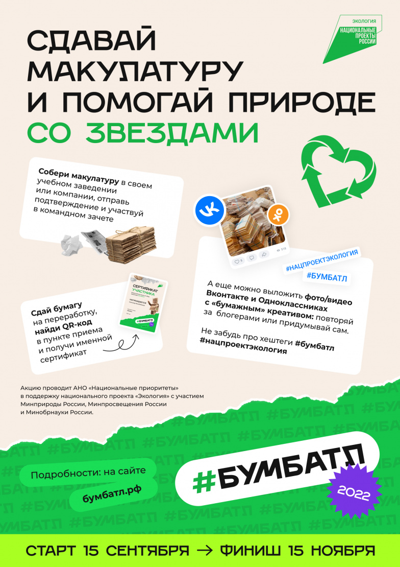 «БумБатл» — это ежегодная акция движения «Экосистема» по сбору макулатуры в поддержку Нацпроекта «Экология».