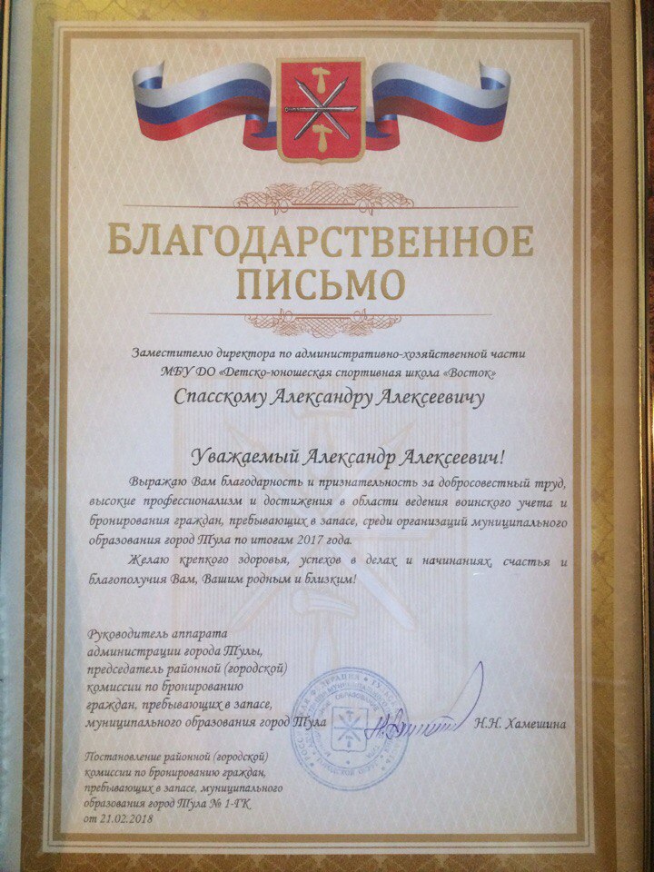 По итогам 2017 года спортивная школа «Восток» признана лучшей организацией по ведению воинского учета и бронирования граждан, пребывающих в запасе. Мы с глубоким уважением поздравляем заместителя директора по хозяйственной части А.А. Спасского с получением Благодарственного письма!