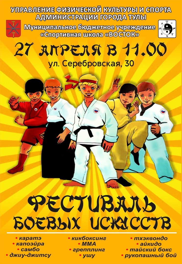 27 апреля в городе Тула (ул. Серебровская 30) состоится фестиваль боевых искусств. Начало в 11:00.