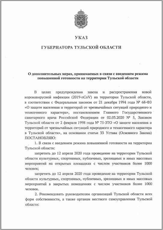 В связи с введением мер по предупреждению и распространения новой коронавирусной инфекции (2019-nCoV ) на территории Тульской области, в соответствии с Постановлением Правительства Тульской области от 16.03.2020 №112, Указом губернатора Тульской области от 16.03.2020 №12 , приказом комитета Тульской области по спорту от 16.03.2020 №6, с 17 марта по 12 апреля 2020 г. тренировочные занятия в МБУ СШОР «Восток» отменены.