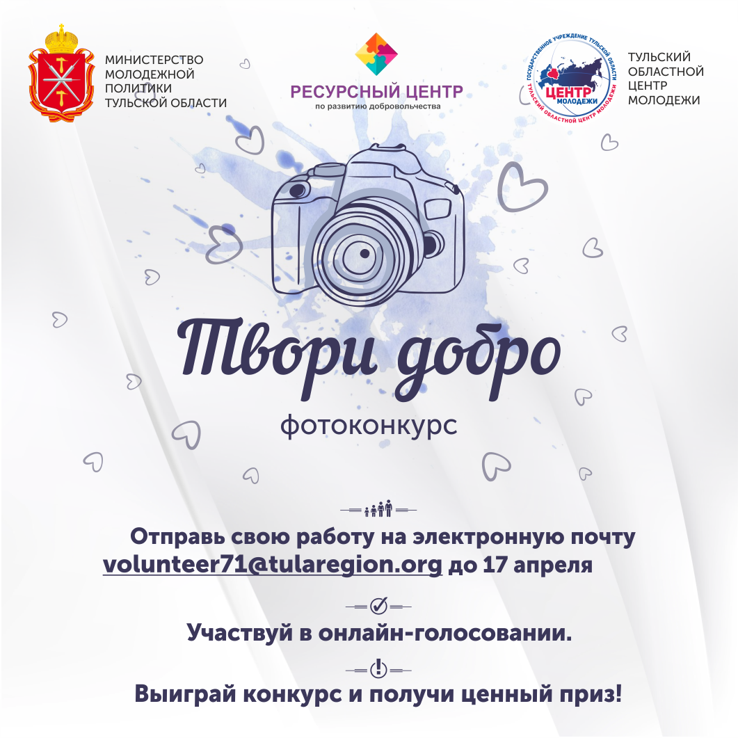 Со 2 марта по 29 мая 2020 года ресурсный центр по развитию добровольчества государственного учреждения Тульской области «Тульский областной центр молодежи» проводит Фот оконкурс «Твори добро» (онлайн).