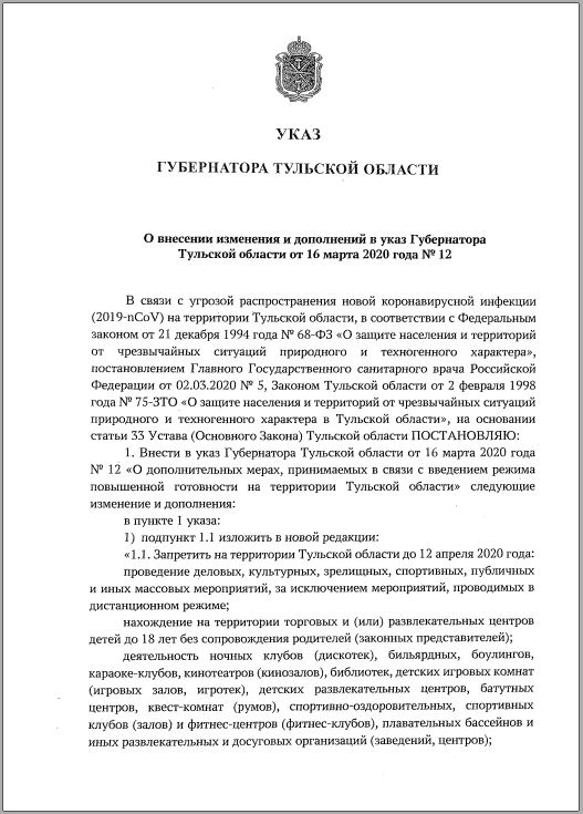 О внесении изменения и дополнений в Указ Губернатора Тульской области от 16 марта 2020 г.