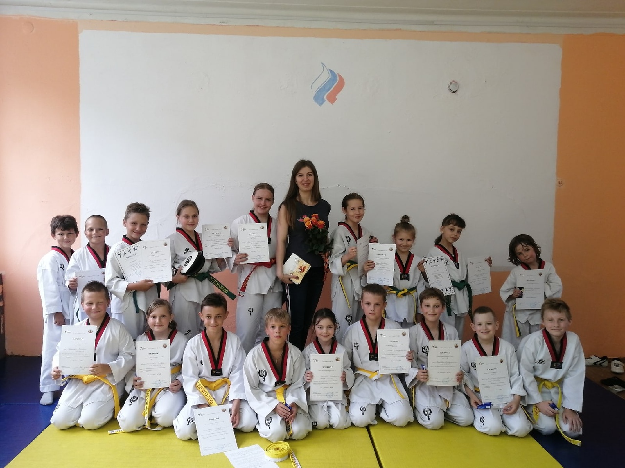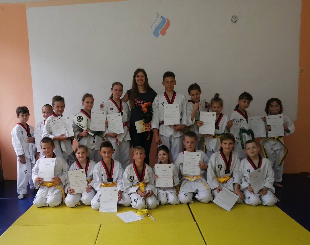 Жёлтый пояс получили: Корнеев Арсений, Голубенкова Варвара, Селиванова Виктория, Дюдин Роман, Буриков Кирилл, Смолякова Сандра, Ветров Марк, Татьянин Константин.