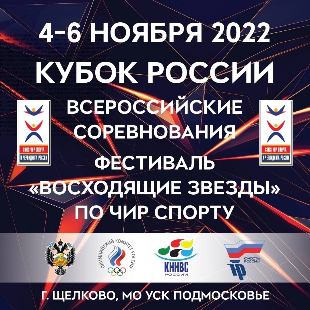 С 4 по 6 ноября 2022 г. в городе Щёлково, Московской области, на базе УСК «Подмосковье» пройдет Кубок России по чир спорту, Всероссийские соревнования по чир спорту и спортивный фестиваль «Восходящие звезды Чир Лига России».